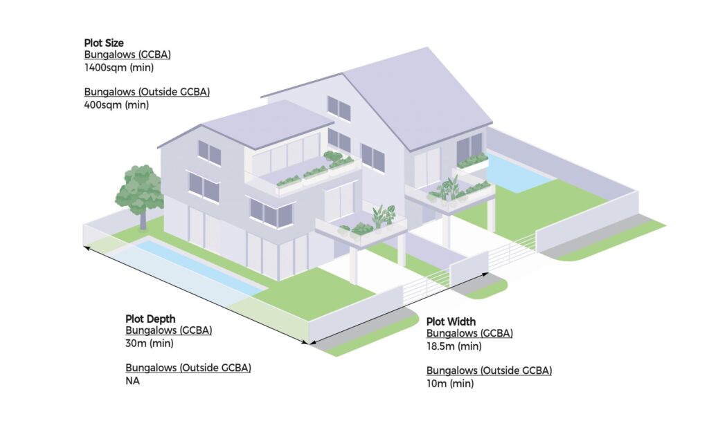 There are four landed build types in Singapore: terrace houses, semi-detached houses, detached houses (or bungalows) and Good Class Bungalows (GCB). They differ from one another in categories such as minimum plot size, width, depth, site coverage, setback control, roof overhang clearance and location (in the case of GCBs)